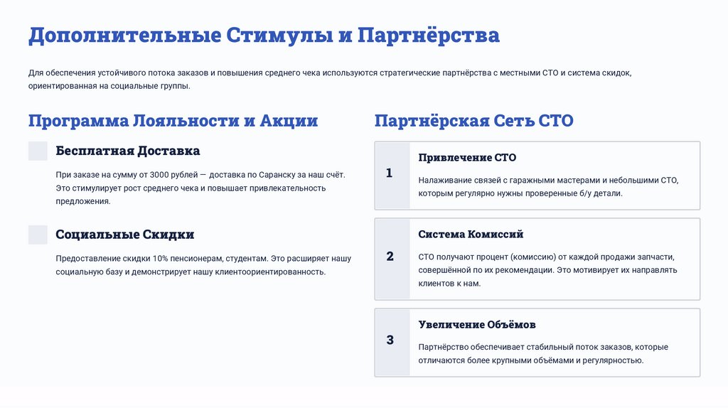 Дополнительные Стимулы и ПартнёрстваДля обеспечения устойчивого потока заказов и повышения среднего чека используются стратегические партнёрства с местными СТО и система скидок,