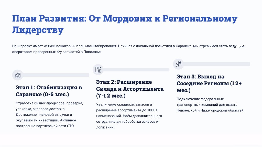 Наш проект имеет чёткий пошаговый план масштабирования. Начиная с локальной логистики в Саранске, мы стремимся стать ведущим