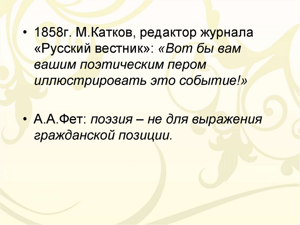 • 1858г. М.Катков, редактор журнала«Русский вестник»: «Вот бы вам