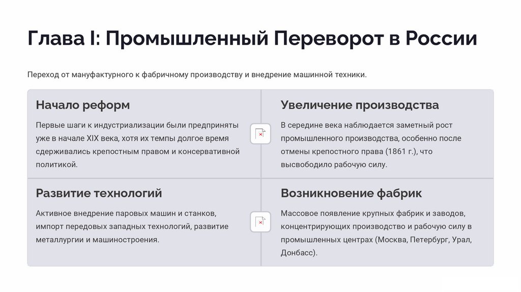 Глава I: Промышленный Переворот в РоссииПереход от мануфактурного к фабричному производству и внедрение машинной техники.