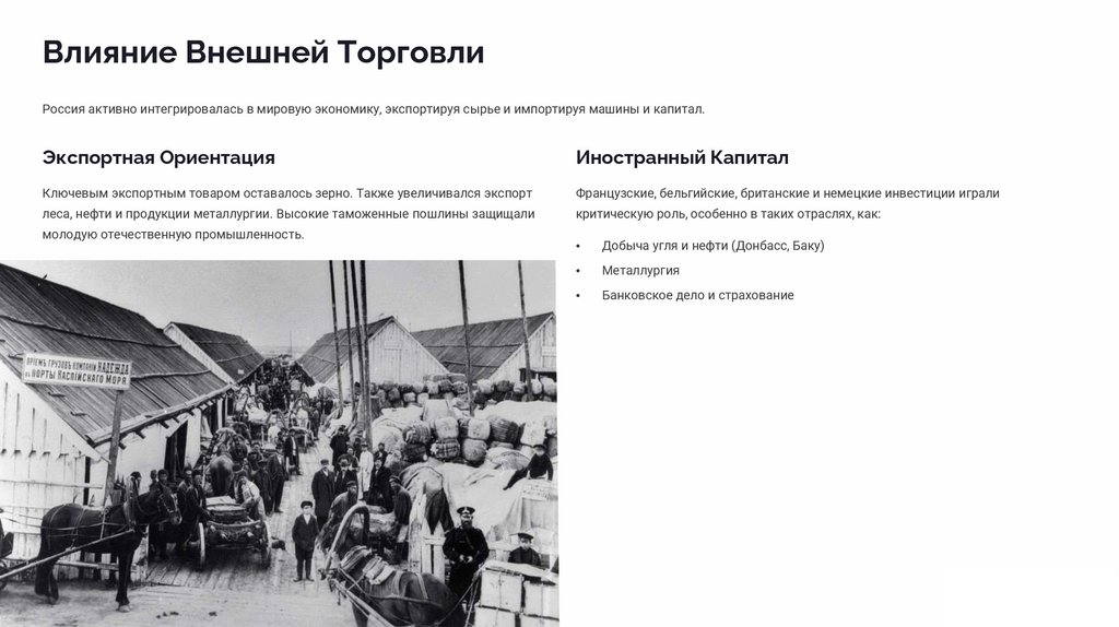 Влияние Внешней ТорговлиРоссия активно интегрировалась в мировую экономику, экспортируя сырье и импортируя машины и капитал.