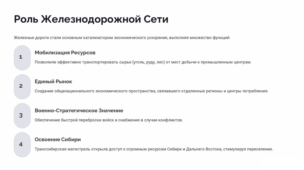 Роль Железнодорожной СетиЖелезные дороги стали основным катализатором экономического ускорения, выполняя множество функций.