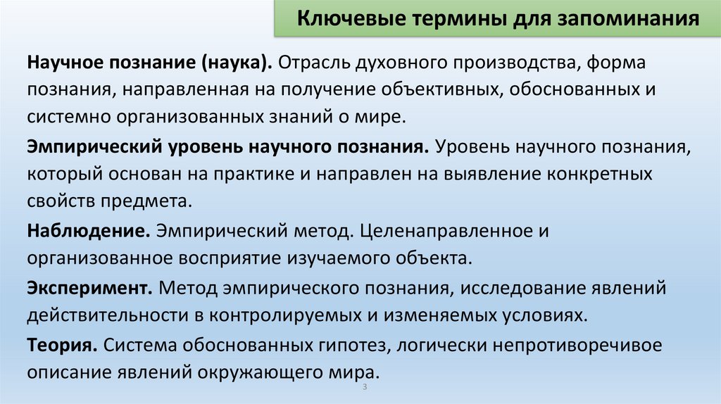 Ключевые термины для запоминанияНаучное познание (наука). Отрасль духовного производства, форма