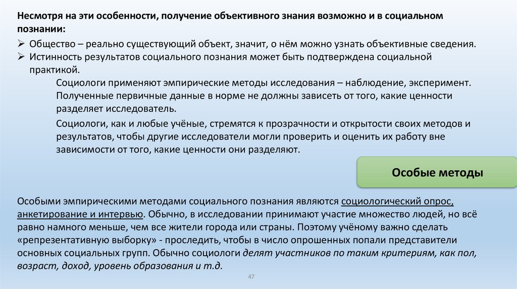 в) получаемое знание всегда связано с интересами субъектов познания, имеет ценностный характер и т.д.