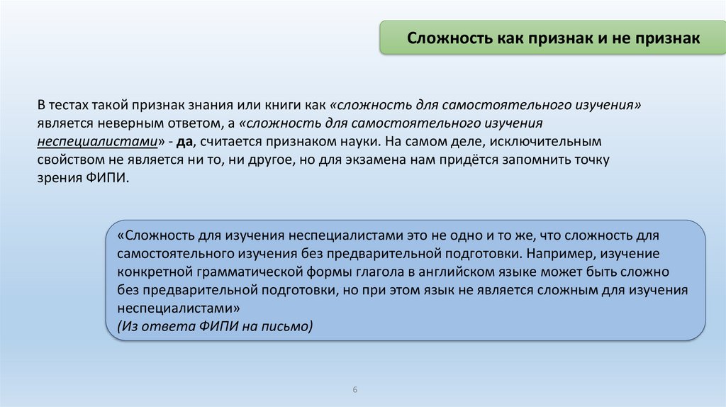 Сложность как признак и не признакВ тестах такой признак знания или книги как «сложность для самостоятельного изучения»