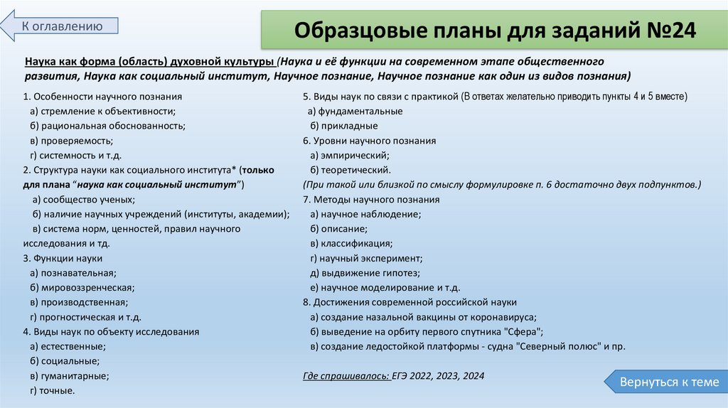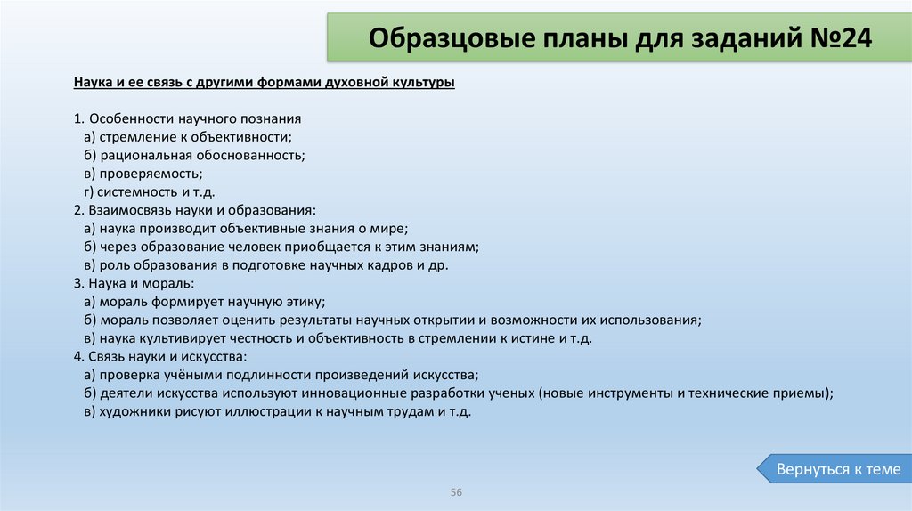 Образцовые планы для заданий №24Наука и ее связь с другими формами духовной культуры