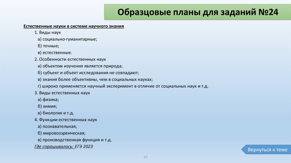 Образцовые планы для заданий №24Естественные науки в системе научного знания