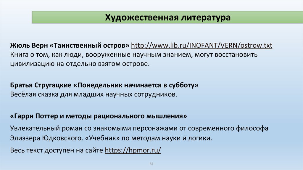 Художественная литератураЖюль Верн «Таинственный остров» http://www.lib.ru/INOFANT/VERN/ostrow.txt