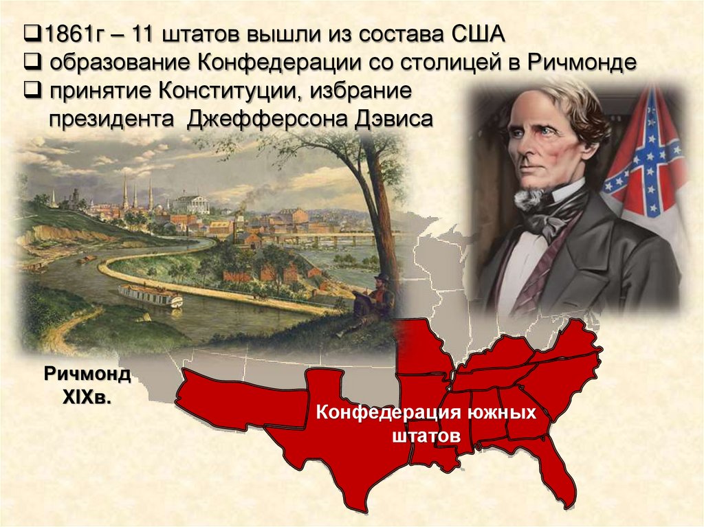 1861г – 11 штатов вышли из состава СШАобразование Конфедерации со столицей в Ричмонде