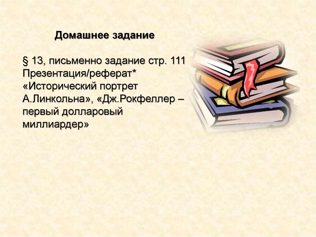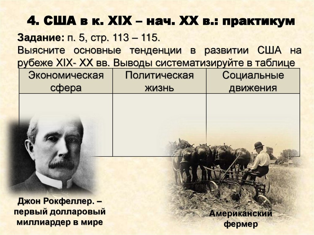 4. США в к. XIX – нач. ХХ в.: практикумЗадание: п. 5, стр. 113 – 115.
