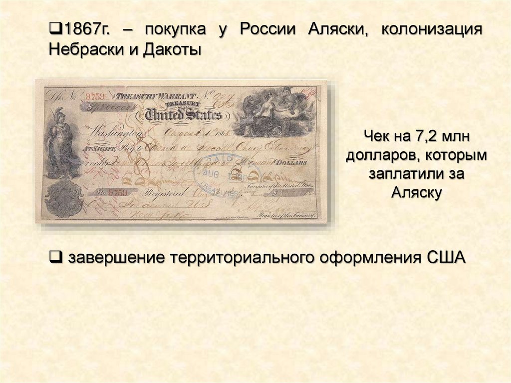 1867г. – покупка у России Аляски, колонизацияНебраски и Дакоты