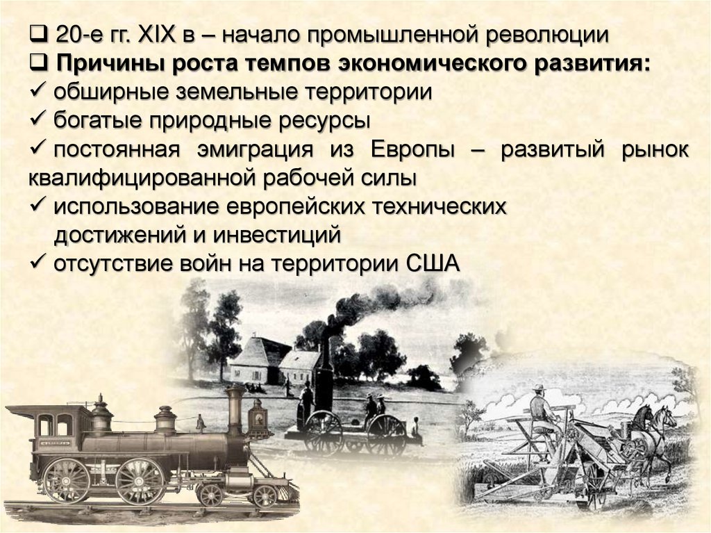 20-е гг. XIX в – начало промышленной революцииПричины роста темпов экономического развития: