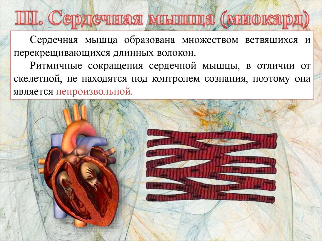 Сердечная мышца образована множеством ветвящихся иперекрещивающихся длинных волокон.