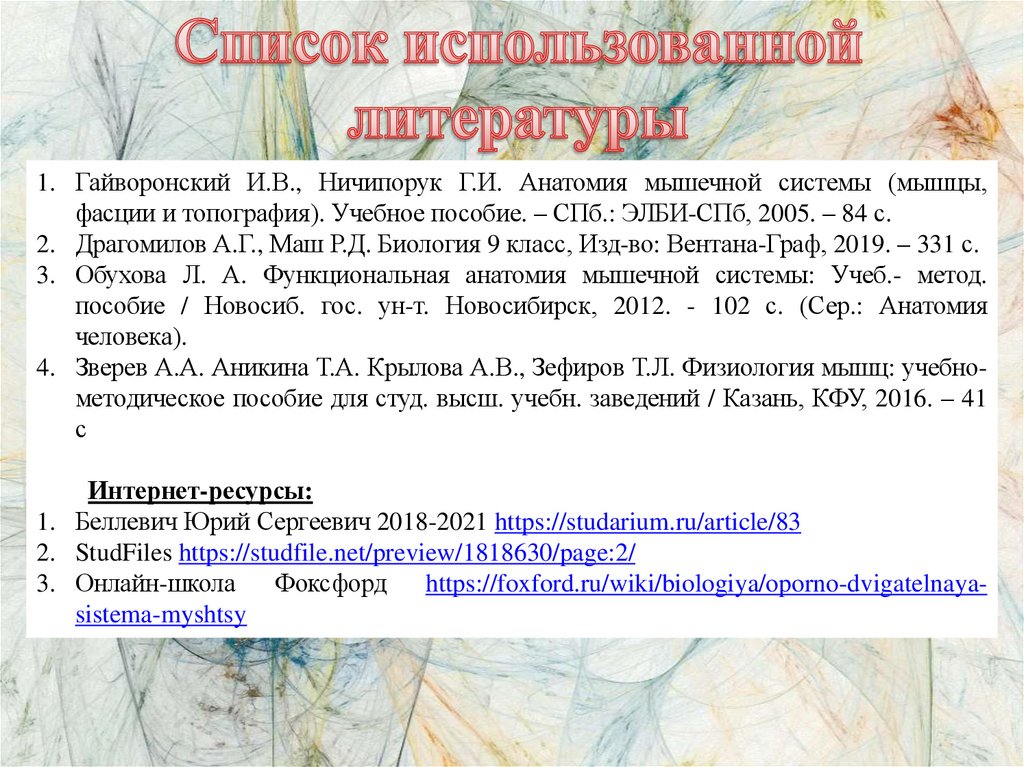 4. Зверев А.А. Аникина Т.А. Крылова А.В., Зефиров Т.Л. Физиология мышц: учебнометодическое пособие для студ. высш. учебн. заведений / Казань, КФУ, 2016. – 41
