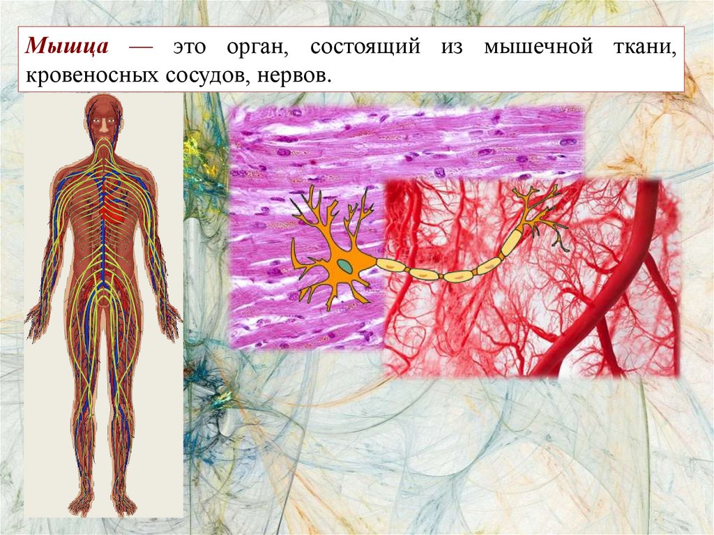 Мышца — это орган, состоящий из мышечной ткани,кровеносных сосудов, нервов.