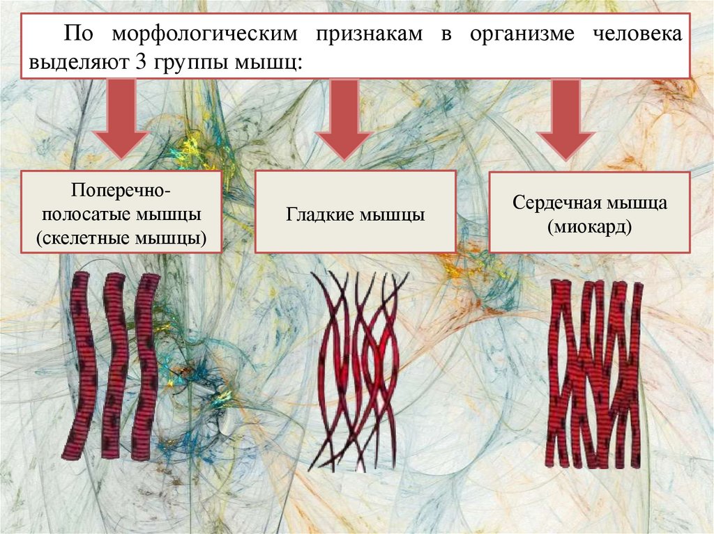 По морфологическим признакам в организме человекавыделяют 3 группы мышц: