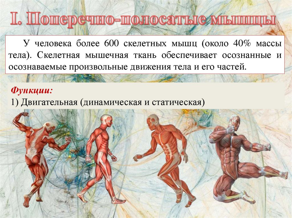 У человека более 600 скелетных мышц (около 40% массытела). Скелетная мышечная ткань обеспечивает осознанные и