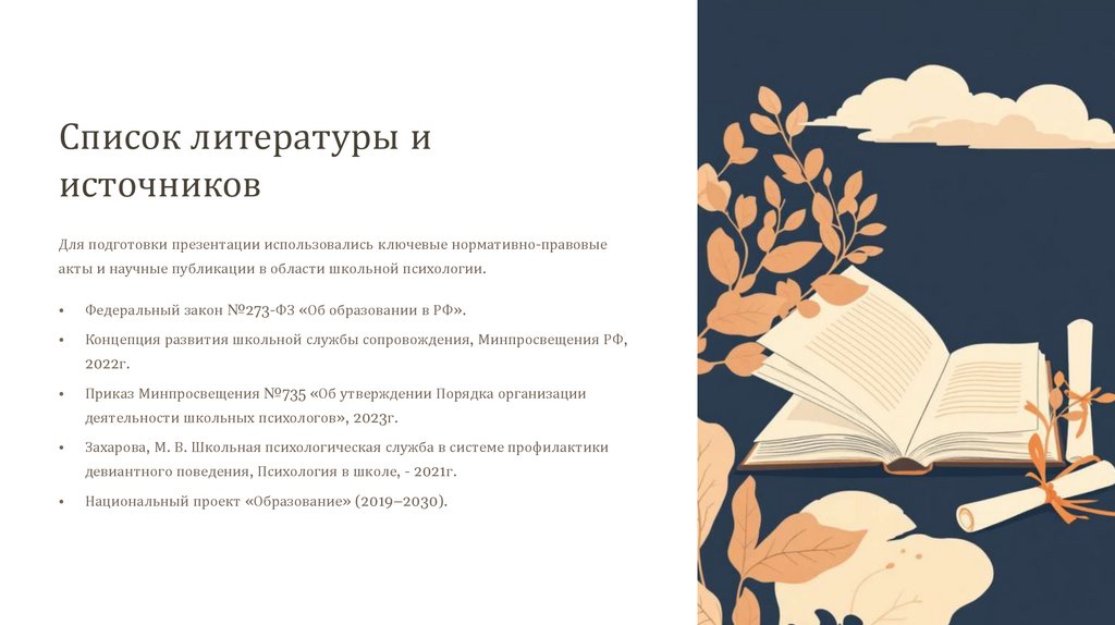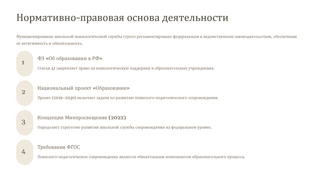 Нормативно-правовая основа деятельностиФункционирование школьной психологической службы строго регламентировано федеральным и ведомственным законодательством, обеспечивая