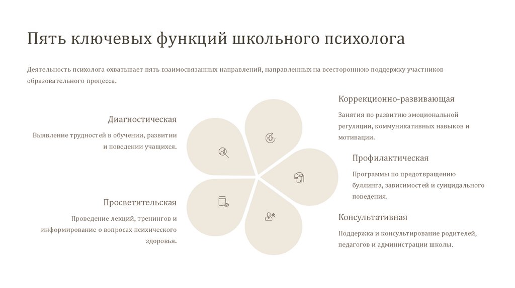 Пять ключевых функций школьного психологаДеятельность психолога охватывает пять взаимосвязанных направлений, направленных на всестороннюю поддержку участников
