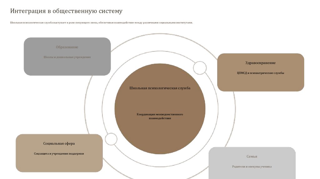 Интеграция в общественную системуШкольная психологическая служба выступает в роли связующего звена, обеспечивая взаимодействие между различными социальными институтами.