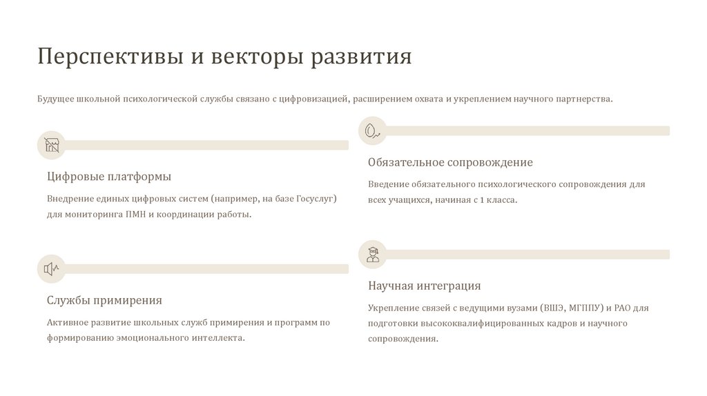 Перспективы и векторы развитияБудущее школьной психологической службы связано с цифровизацией, расширением охвата и укреплением научного партнерства.