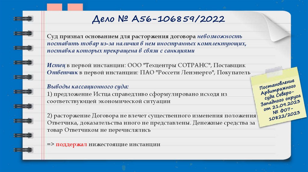 Дело № А56-106859/2022Суд признал основанием для расторжения договора невозможность