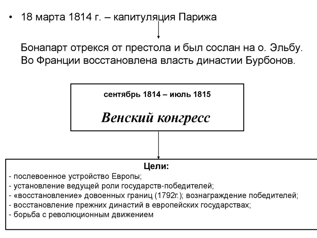 • 18 марта 1814 г. – капитуляция ПарижаБонапарт отрекся от престола и был сослан на о. Эльбу.