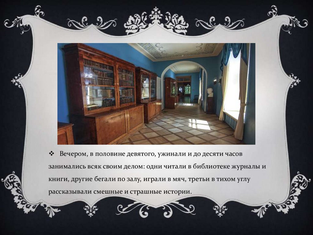 Вечером, в половине девятого, ужинали и до десяти часовзанимались всяк своим делом: одни читали в библиотеке журналы и