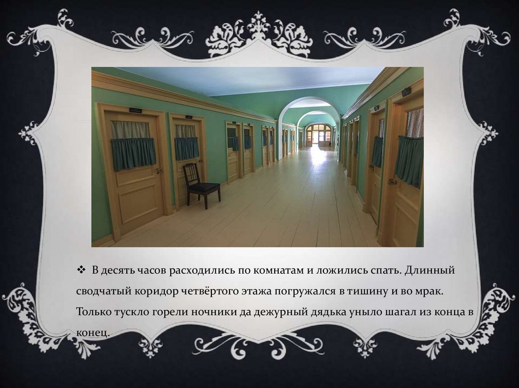 В десять часов расходились по комнатам и ложились спать. Длинныйсводчатый коридор четвёртого этажа погружался в тишину и во мрак.