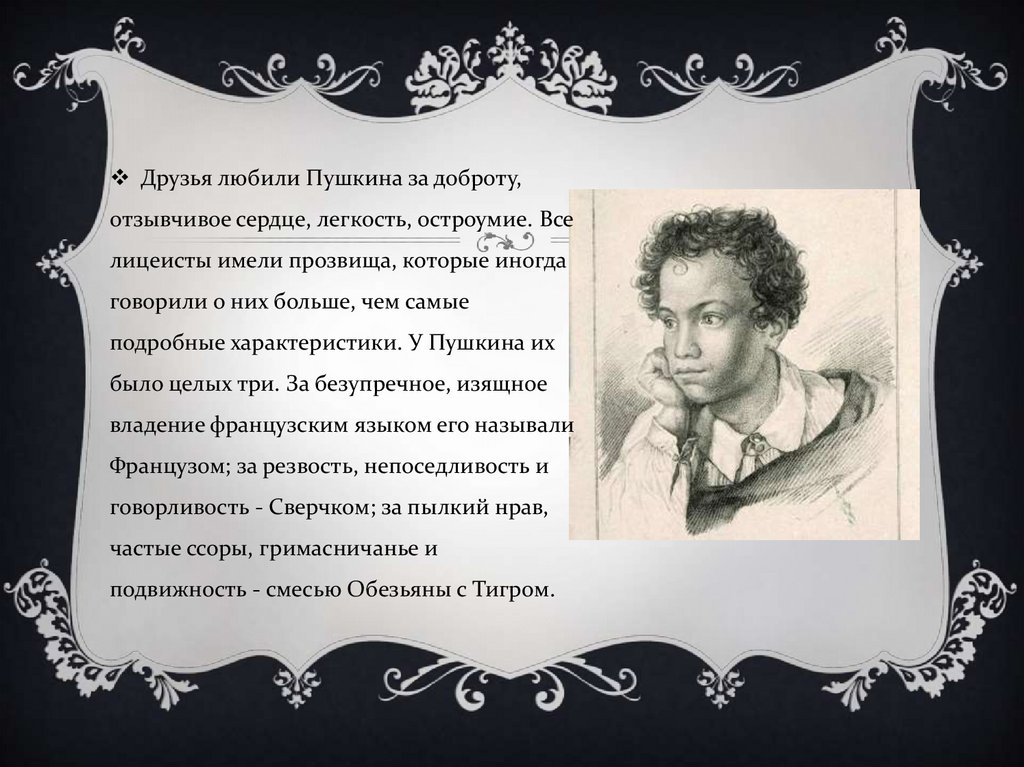 Друзья любили Пушкина за доброту,отзывчивое сердце, легкость, остроумие. Все