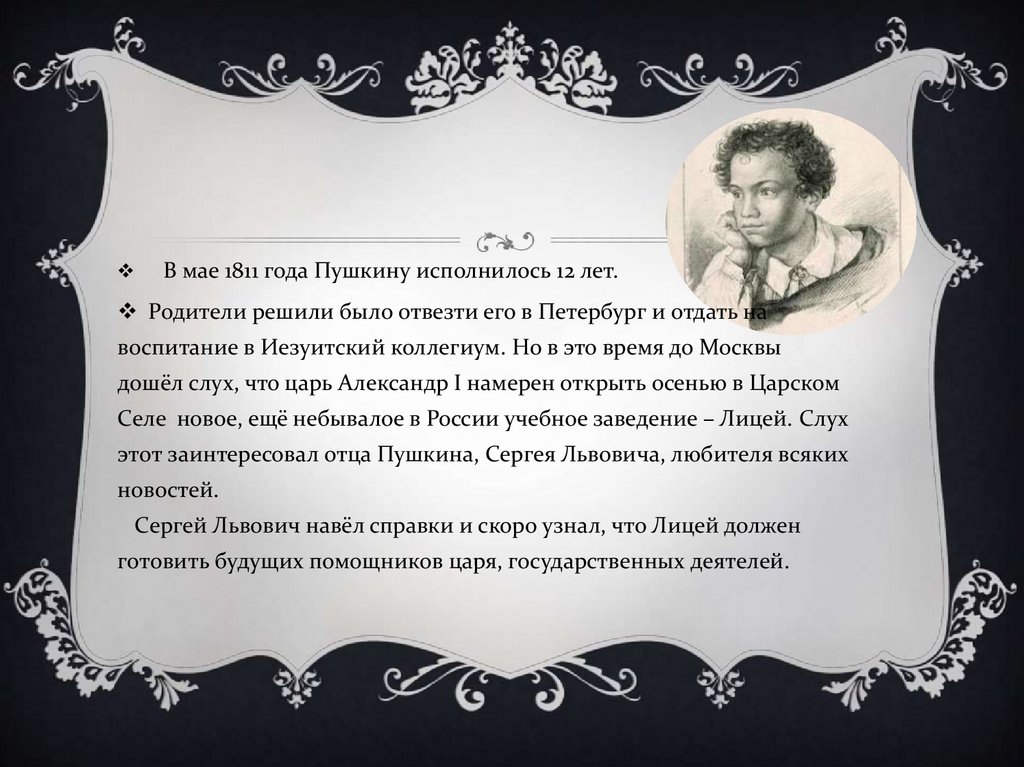В мае 1811 года Пушкину исполнилось 12 лет.Родители решили было отвезти его в Петербург и отдать на