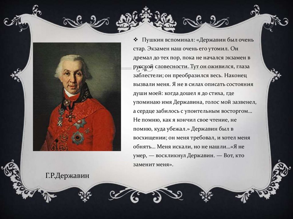 Пушкин вспоминал: «Державин был оченьстар. Экзамен наш очень его утомил. Он