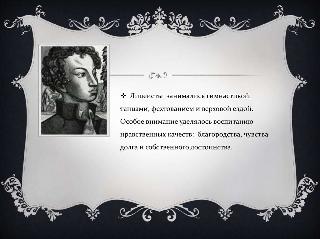 Лицеисты занимались гимнастикой,танцами, фехтованием и верховой ездой.