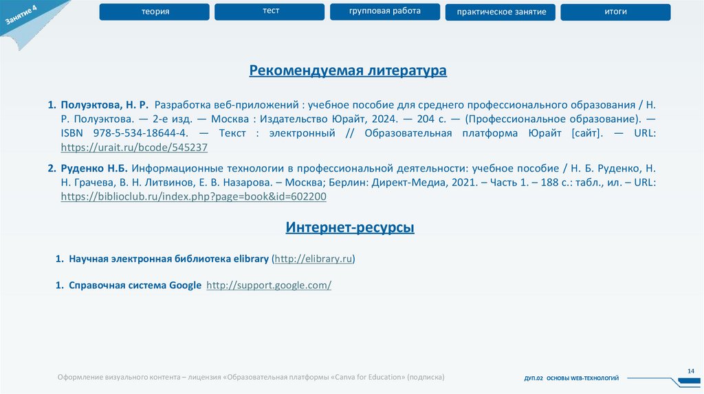 1. Полуэктова, Н. Р. Разработка веб-приложений : учебное пособие для среднего профессионального образования / Н.