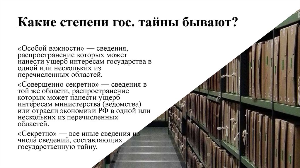 Какие степени гос. тайны бывают?«Особой важности» — сведения,