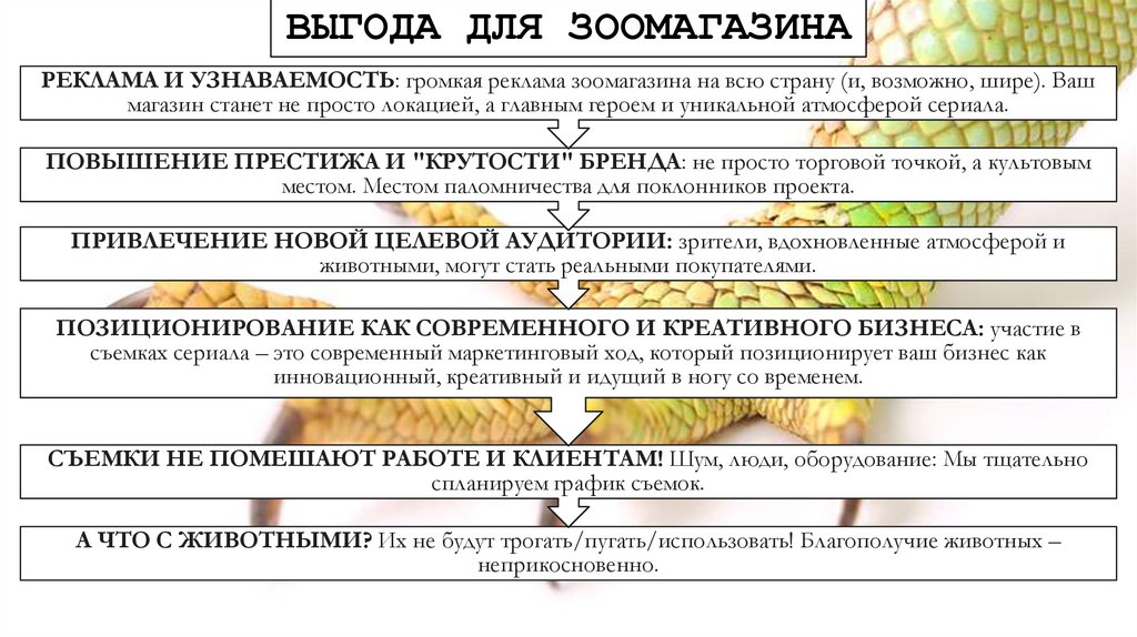 ВЫГОДА ДЛЯ ЗООМАГАЗИНАРЕКЛАМА И УЗНАВАЕМОСТЬ: громкая реклама зоомагазина на всю страну (и, возможно, шире). Ваш