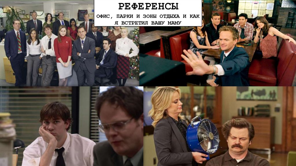 Смесь неловкого юмора (прямые взгляды в камеру, неуклюжие
