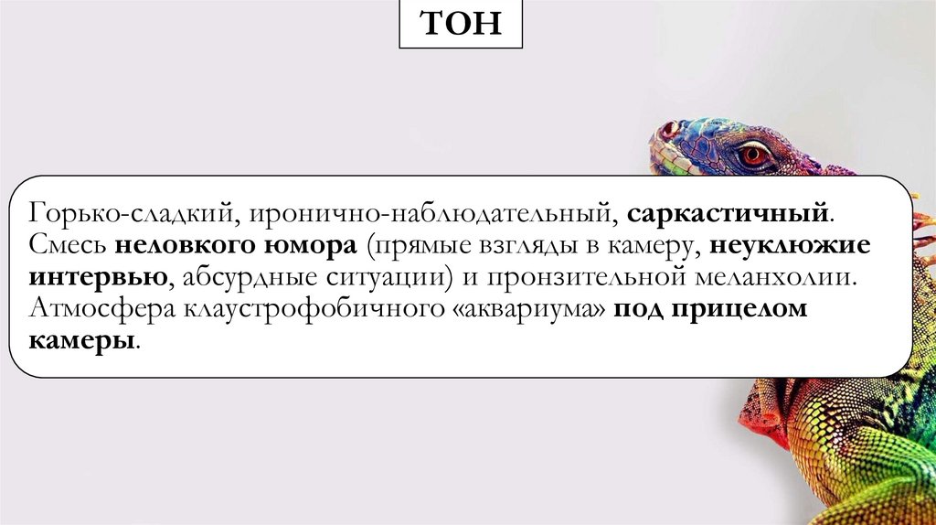 ТОНГорько-сладкий, иронично-наблюдательный, саркастичный.