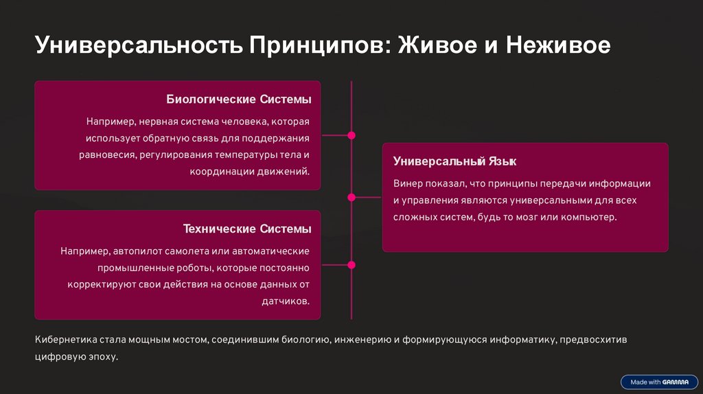 Кибернетика стала мощным мостом, соединившим биологию, инженерию и формирующуюся информатику, предвосхитив