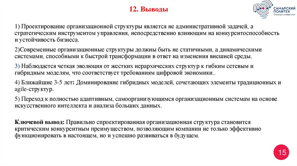 12. Выводы1) Проектирование организационной структуры является не административной задачей, а
