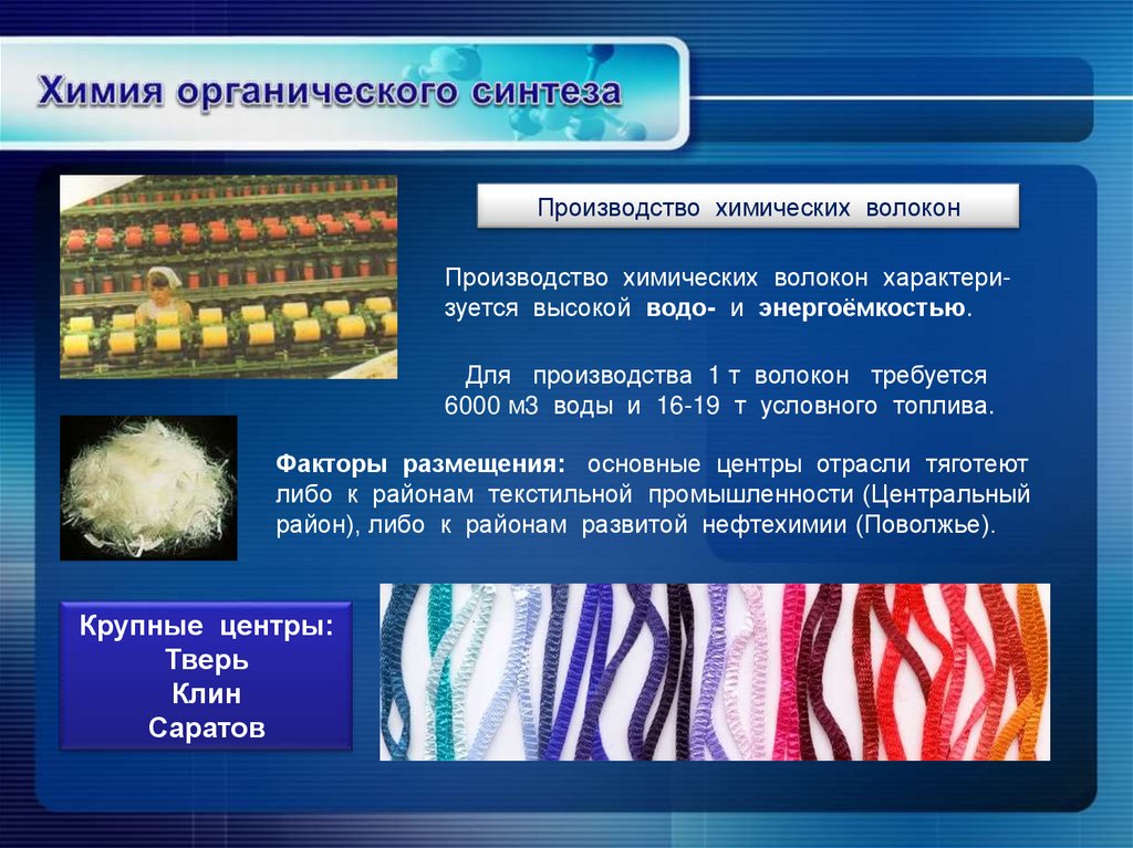 • химические волокна (искусственные - Рязань, Тверь, Санкт-Петербург, Шуя; синтетические - Курск; и. и с. - Клин, Серпухов),