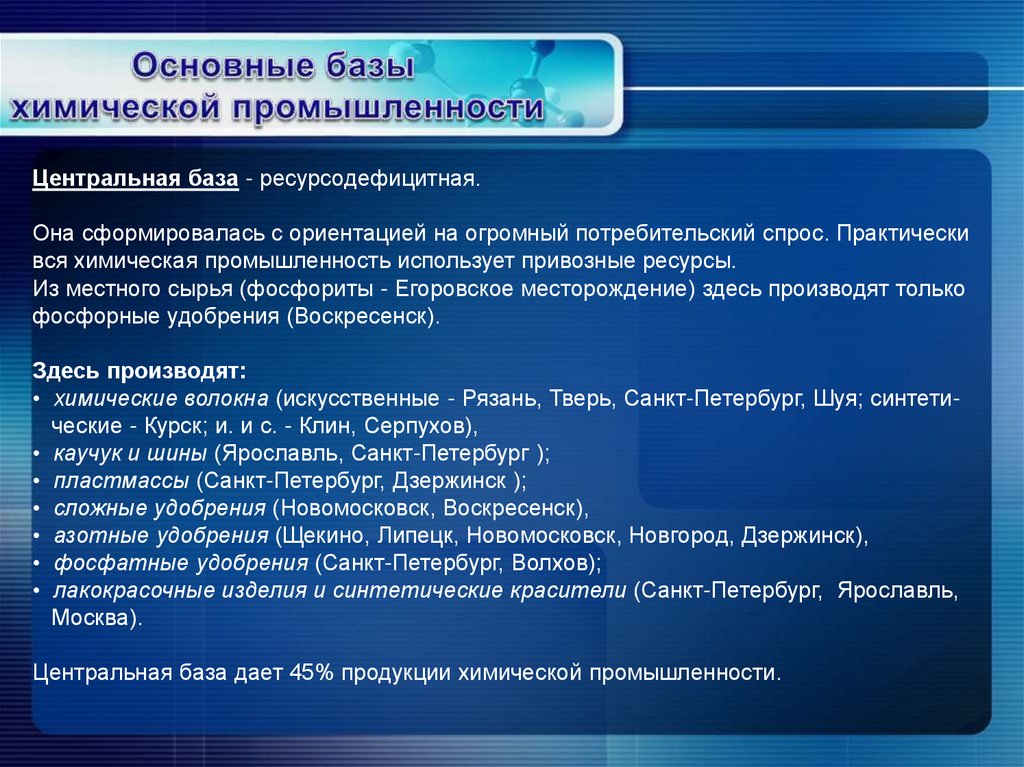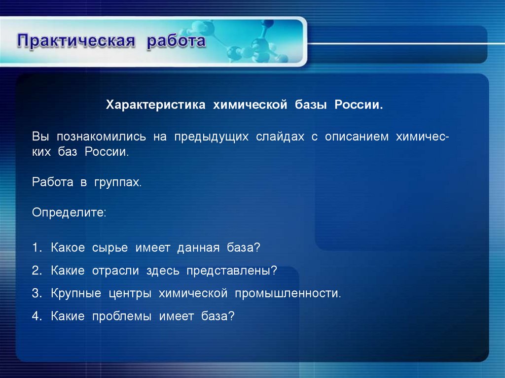 Характеристика химической базы России.Вы познакомились на предыдущих слайдах с описанием химических баз России.