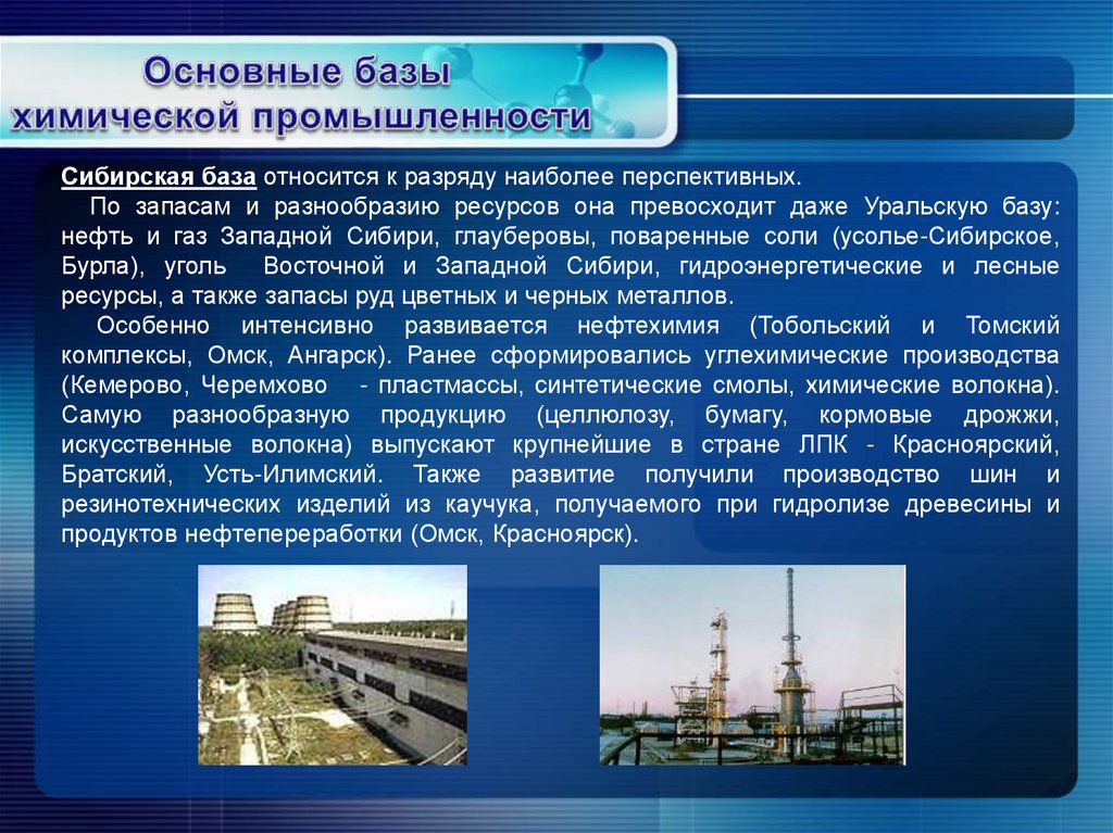 Сибирская база относится к разряду наиболее перспективных.По запасам и разнообразию ресурсов она превосходит даже Уральскую базу: