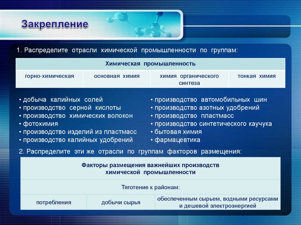 1. Распределите отрасли химической промышленности по группам:Химическая промышленность