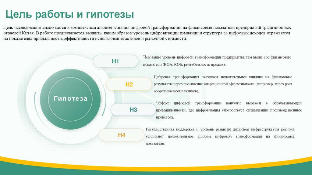 Цель работы и гипотезыЦель исследования заключается в комплексном анализе влияния цифровой трансформации на финансовые показатели предприятий традиционных