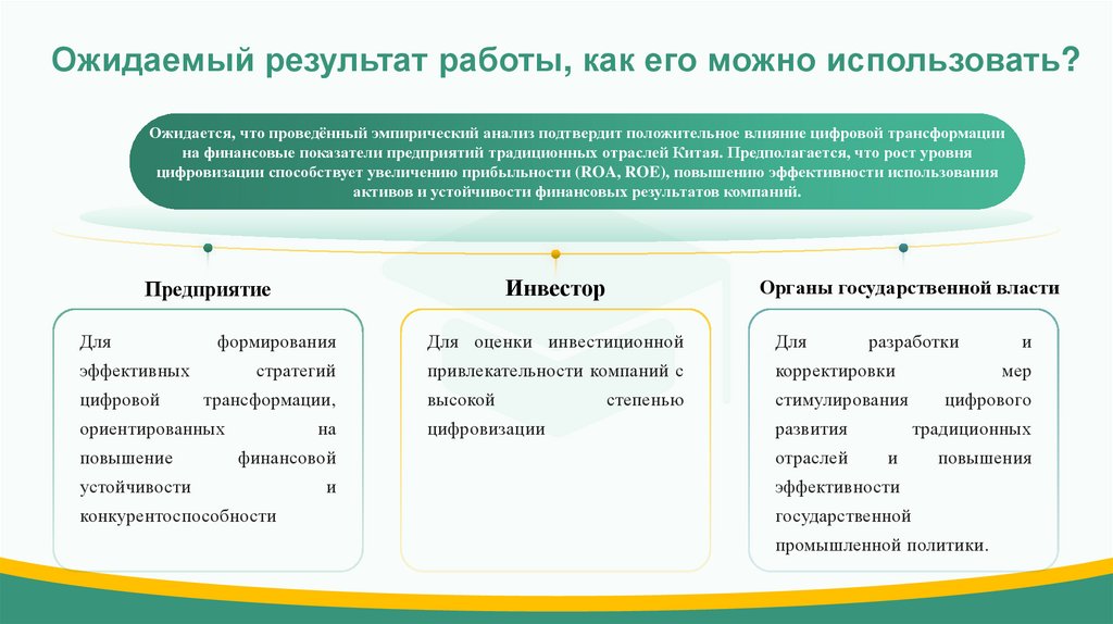 Ожидаемый результат работы, как его можно использовать?Ожидается, что проведённый эмпирический анализ подтвердит положительное влияние цифровой трансформации