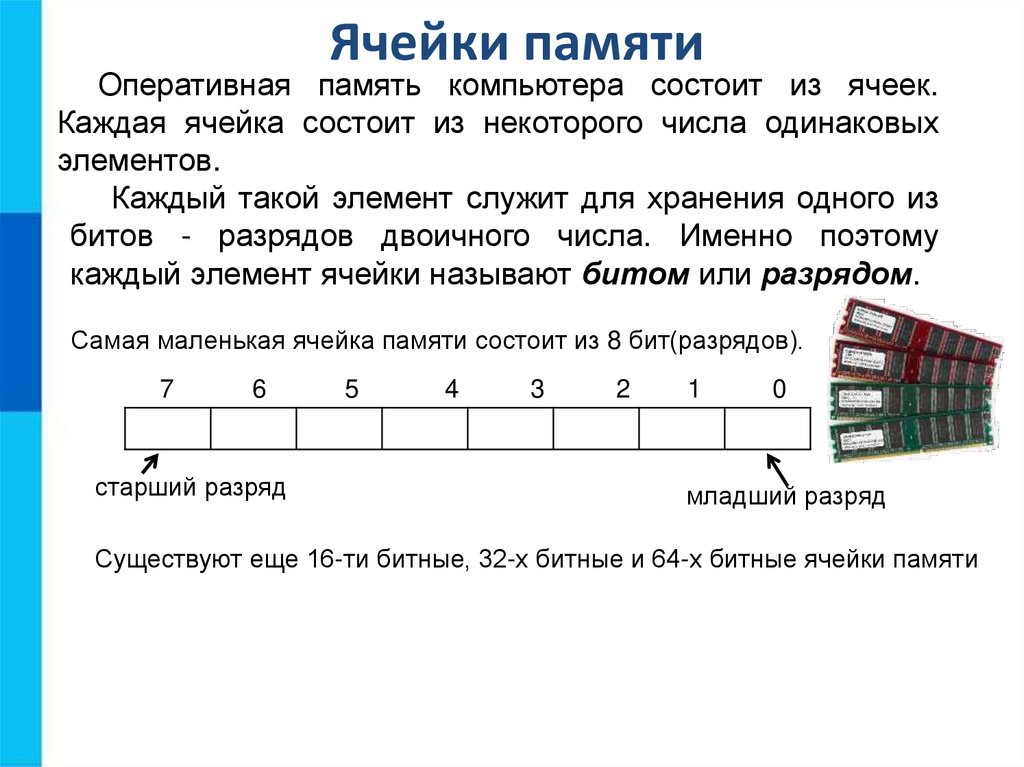 Самая маленькая ячейка памяти состоит из 8 бит(разрядов).