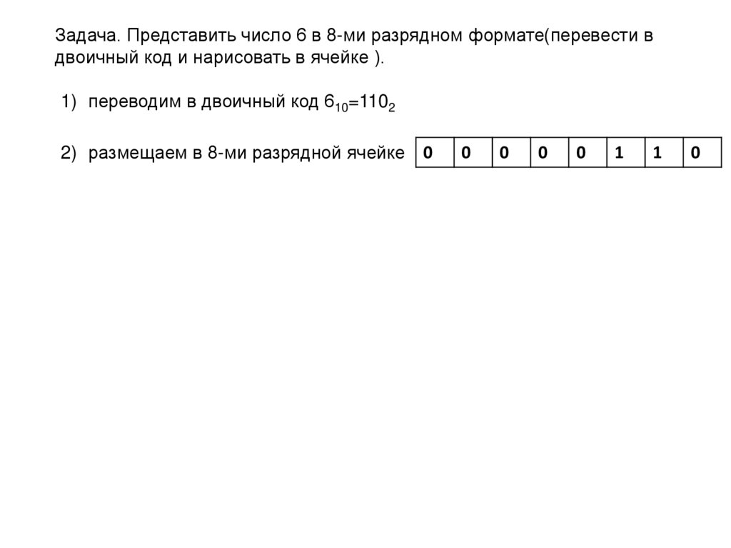 Задача. Представить число 6 в 8-ми разрядном формате(перевести вдвоичный код и нарисовать в ячейке ).