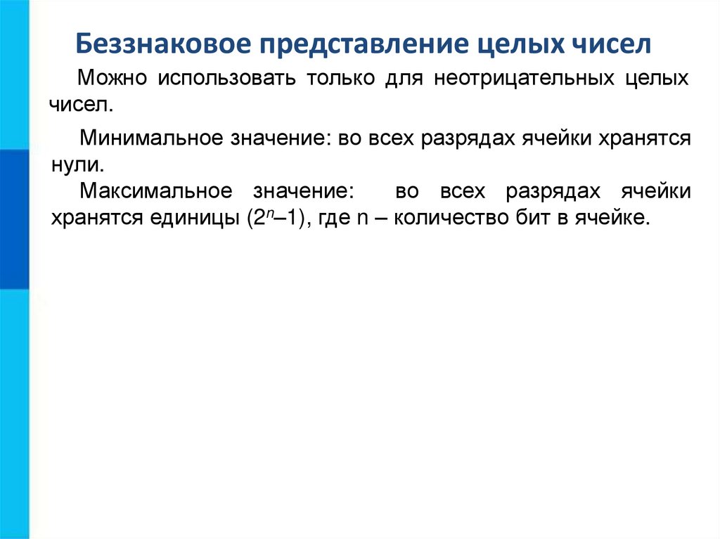Беззнаковое представление целых чиселМожно использовать только для неотрицательных целых