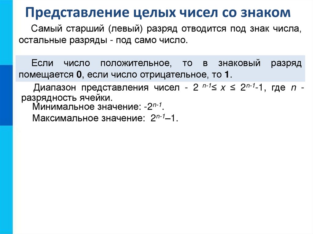 Представление целых чисел со знакомСамый старший (левый) разряд отводится под знак числа,
